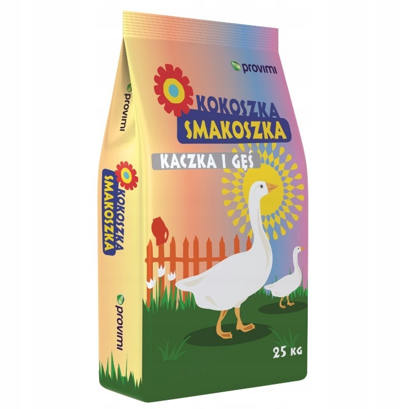 Pasza dla kaczek i gęsi KOKOSZKA SMAKOSZKA (PD600X00) w formie granulatu w wieku od 4 tygodnia tuczu (od 28. dnia) jako wyłączna pasza.
